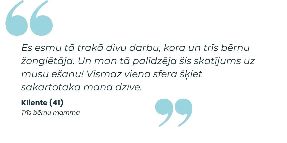 Nevis aizliegumi, plāni un režīms, bet padomi kā izdzīvot dinamiskā ikdienā, bez cīņas ēst pie viena galda, vienu ēdienu, nevis gatavot katram savu.