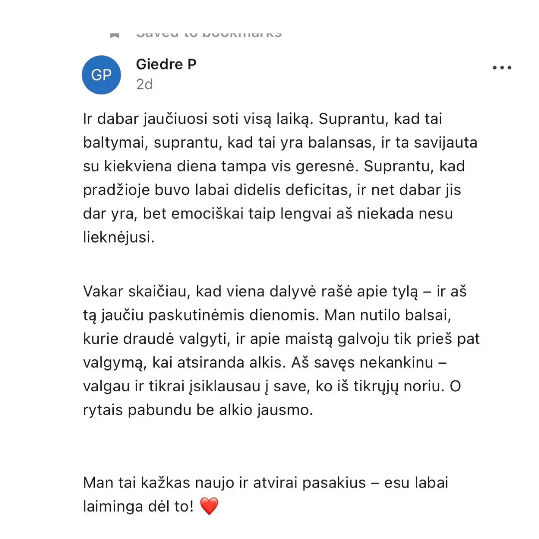 Jei valgymas pradeda trukdyti tavo gyvenimui, tai nebėra sveika. Tikra sveikata yra tada, kai tavo mityba palaiko tavo kasdienybę, o ne tampa papildomu darbu.