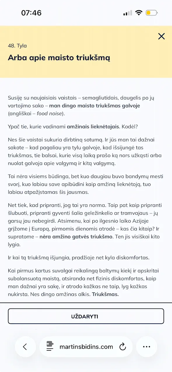 Nes yra du būdai, kaip galima mokyti apie mitybą. Viena yra „kaip reikia“ pusė: sterili, perfekcionistinė ir atitrūkusi nuo realybės. Ji bando pakeisti žmogų, kad šis atitiktų planą, o jei nepavyksta – „pats kaltas“. Antra yra manoji – pritaikyti mitybą žmogui. Suprasti, kad nei gyvenimas, nei valgymas nėra tobulas. Mano užduotis yra rasti tą vidurio kelią, kur patenkinami tiek tavo kūno poreikiai, tiek tavo žmogiški norai.