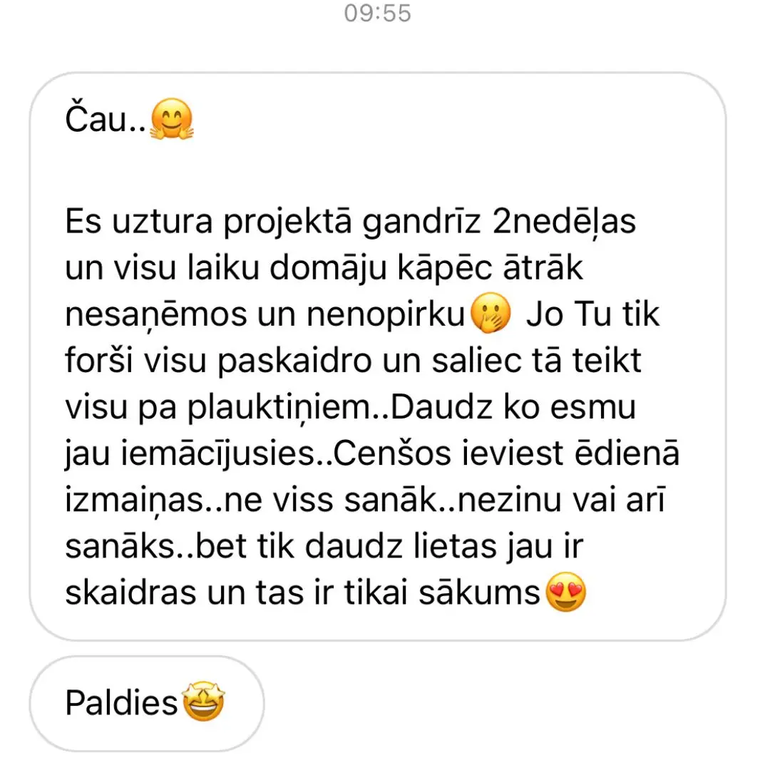 Tāpēc ir draudzīga vide - tu vari jautāt JEBKO. Un saņemt atbildi un palīdzību. Turklāt ir 7 dienas, kurās vari pārdomāt un saņemt samaksāto atpakaļ. Lai ir caurspīdīgi un godīgi!