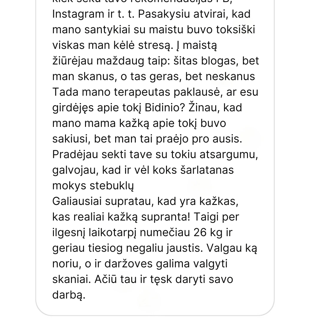 Nes yra du būdai, kaip galima mokyti apie mitybą. Viena yra „kaip reikia“ pusė: sterili, perfekcionistinė ir atitrūkusi nuo realybės. Ji bando pakeisti žmogų, kad šis atitiktų planą, o jei nepavyksta – „pats kaltas“. Antra yra manoji – pritaikyti mitybą žmogui. Suprasti, kad nei gyvenimas, nei valgymas nėra tobulas. Mano užduotis yra rasti tą vidurio kelią, kur patenkinami tiek tavo kūno poreikiai, tiek tavo žmogiški norai.