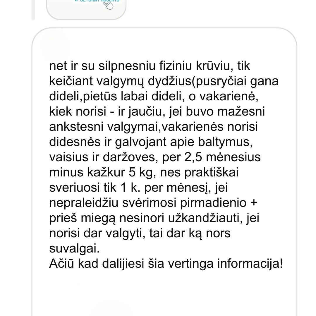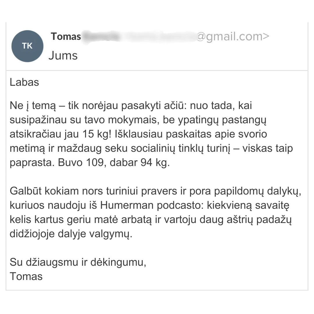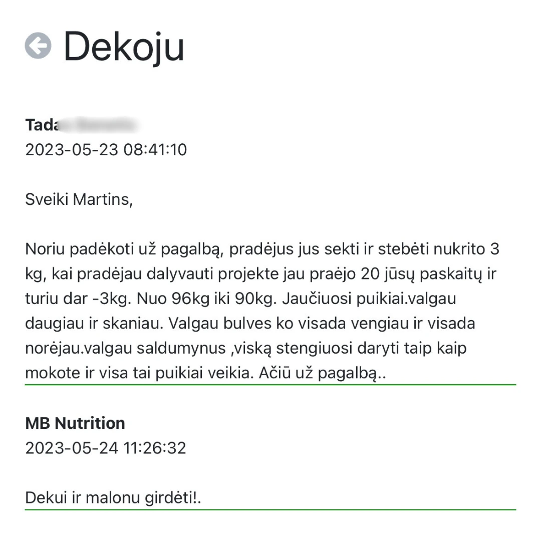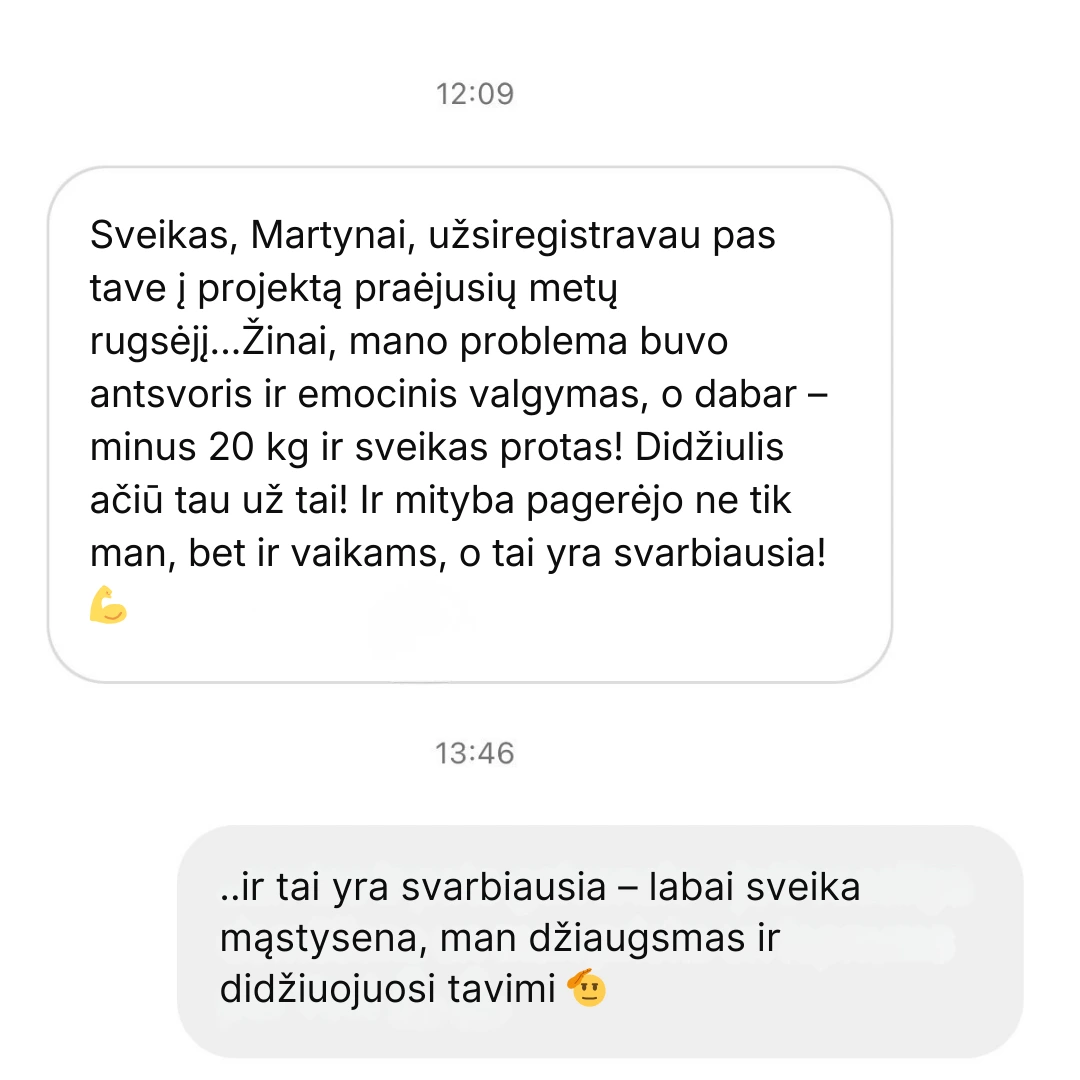 Įgūdžiai ir pilna savo formos kontrolė. Tu gausi ne dar vieną „greitą“ rezultatą, kuris dingsta po mėnesio. Tu išmoksi įdiegti pokyčius į savo realų (o ne idealų) gyvenimą, kad svoris ir energijos lygis liktų tavo kontrolėje ir pasibaigus projektui
