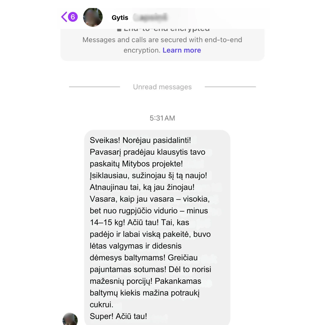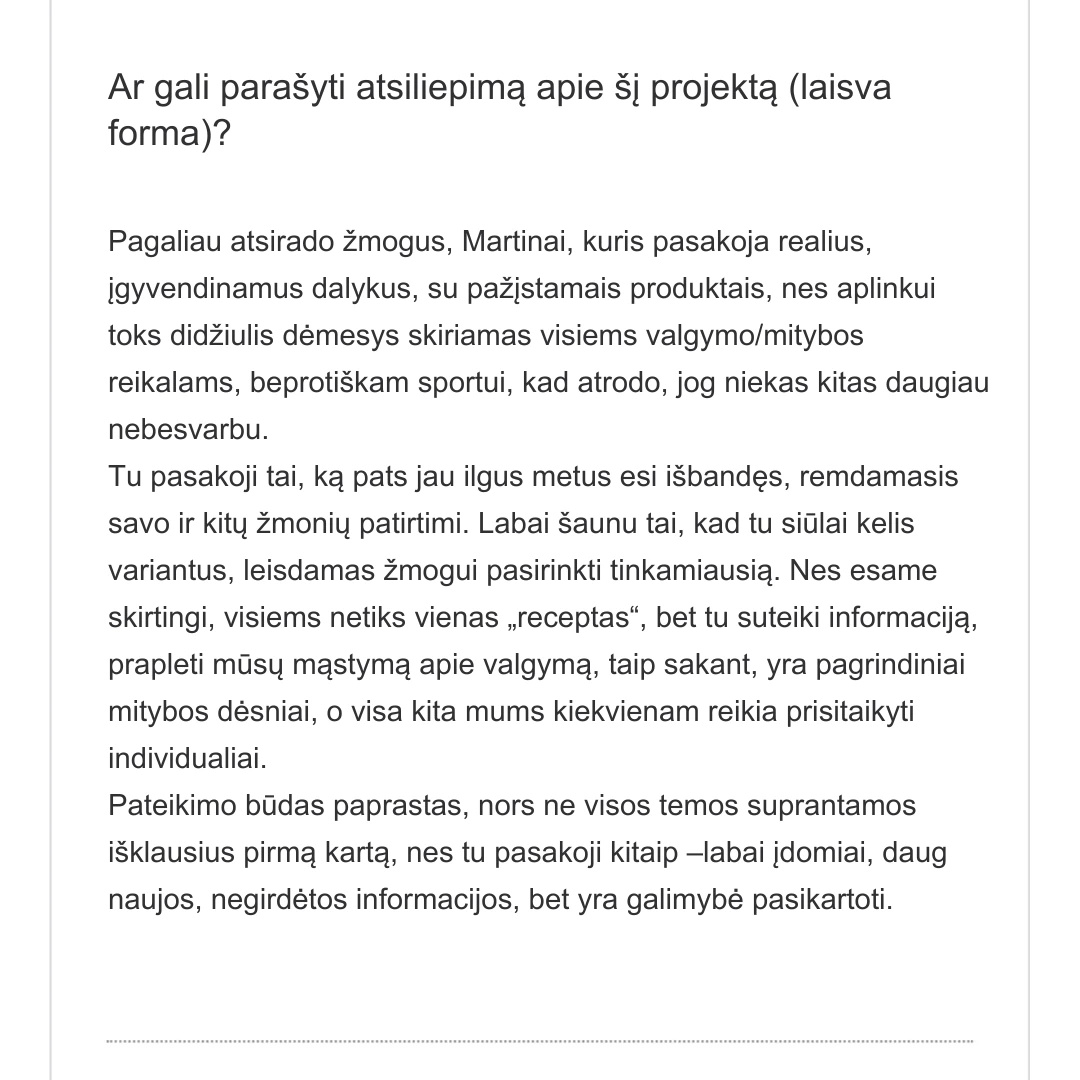 Kitaip tariant – kiekvienas pritaiko niuansus būtent savo gyvenimui, o ne aklai seka vienodą mitybos planą.Vystau tai jau 8 metus su daugiau nei 14 tūkstančių žmonių – tiek vyrų, tiek moterų, nuo 15 iki 84 metų. Nuo tų, kurie žengia patį pirmąjį žingsnį, iki tų, kurie jau išbandė viską...
